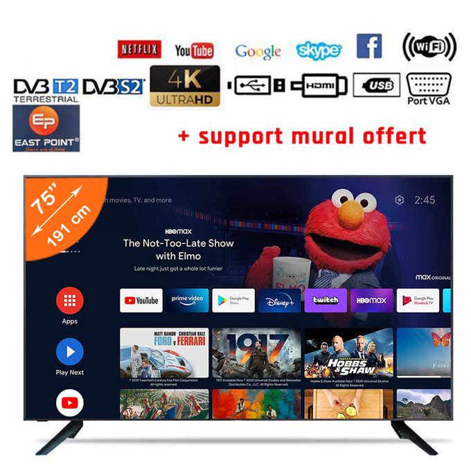 Grâce aux entrées High Definition Multimedia Interface (HDMI), le téléviseur East Point TV 65’’ HD transformera votre salon en un véritable centre de divertissement multimédia. En effet, la technologie HDMI permet une transmission à haute vitesse de données numériques à haute définition directement sur votre téléviseur depuis une large variété d’appareils.